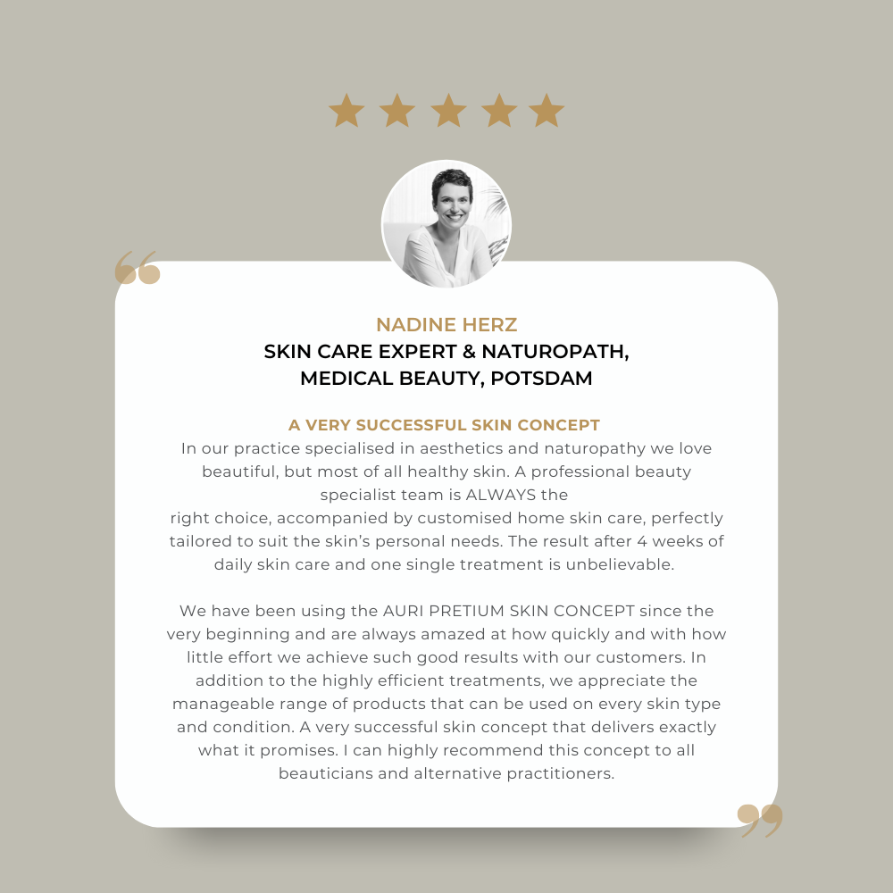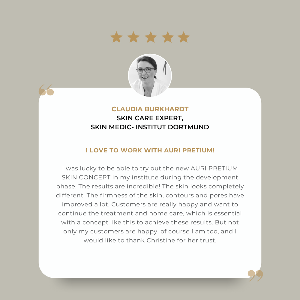 The combination of in-salon treatments and daily skincare creates powerful, visible improvements while keeping the skin balanced and protected. Developed in close collaboration with dermatologists, cosmetic surgeons, alternative practitioners, and beauticians, the AURI PRETIUM SKIN CONCEPT has been proven effective through over 150 professional treatments and user tests.