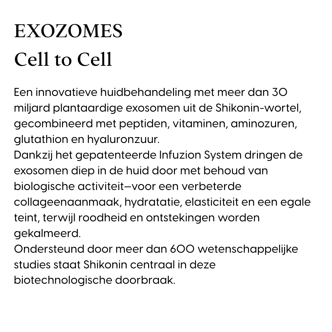 De Infuzion System® producten bevatten niet-dierlijk hyaluronzuur afkomstig van niet-pathogene microbiële fermentatie. De BOOZTER is rijk aan hyaluronzuur, vitamines en antioxidanten, ideaal voor donkere kringen onder de ogen en fijnere rimpels. De VOLYMIZER bevat puur hyaluronzuur, wat extra volume geeft door de grotere moleculaire massa, en is perfect voor het herstellen van verloren volume in de huid.