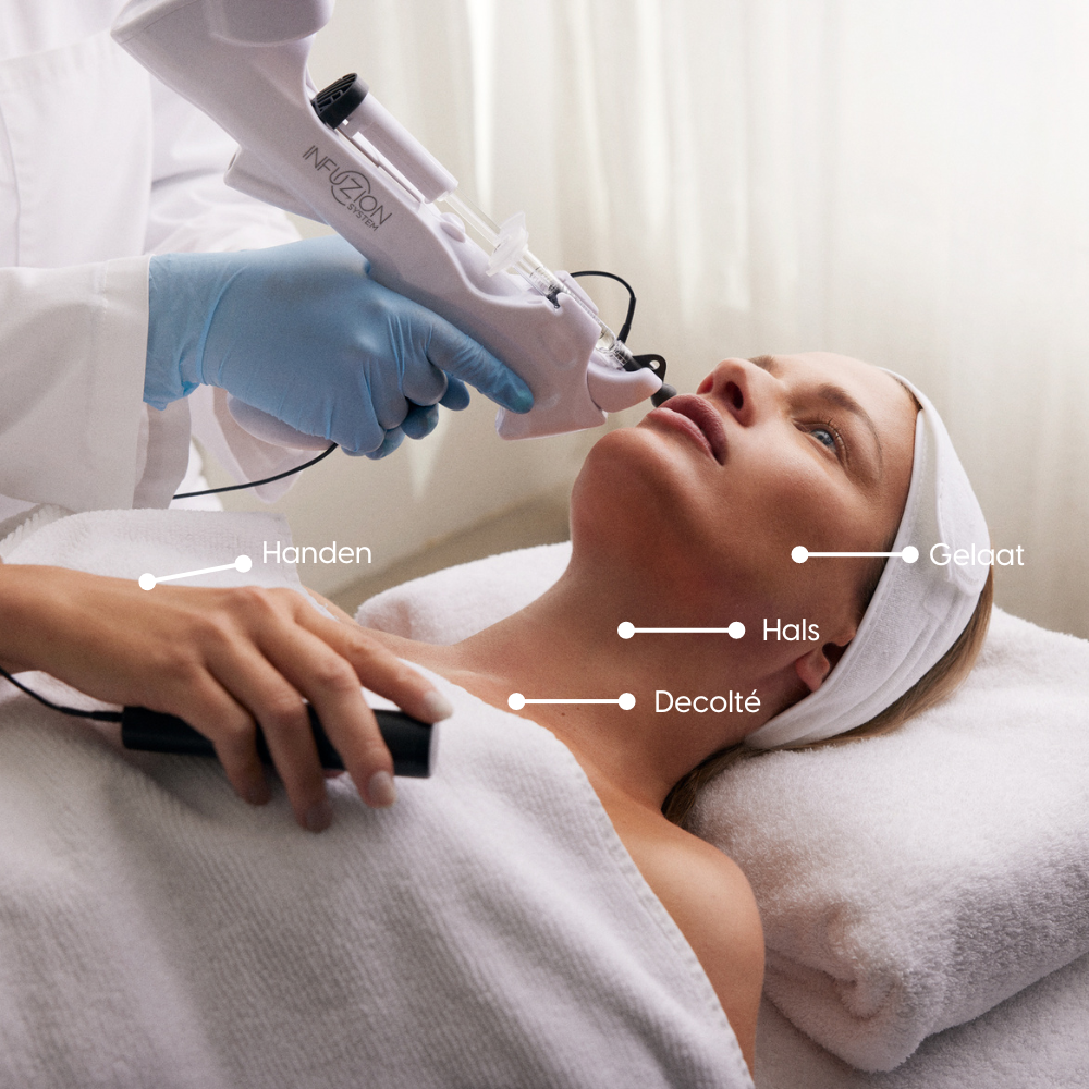 Met behulp van galvanische stroom brengt Infuzion System® hyaluronzuur diep in de huid, zonder de pijn van naalden. De behandeling is veilig, pijnloos, en duurt maximaal 30 minuten. Infuzion System® is ideaal voor het gelaat, hals, nek, décolleté, en handen.