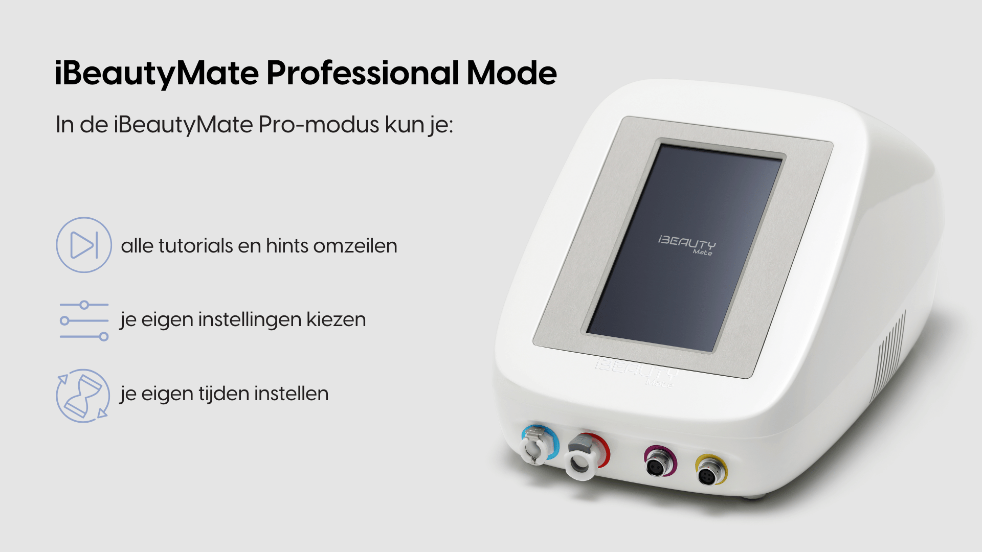De iBeautyMate Pro-modus is speciaal ontworpen voor getrainde professionals. Het biedt volledige controle over:
