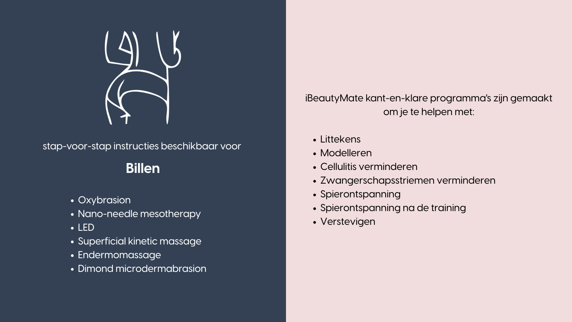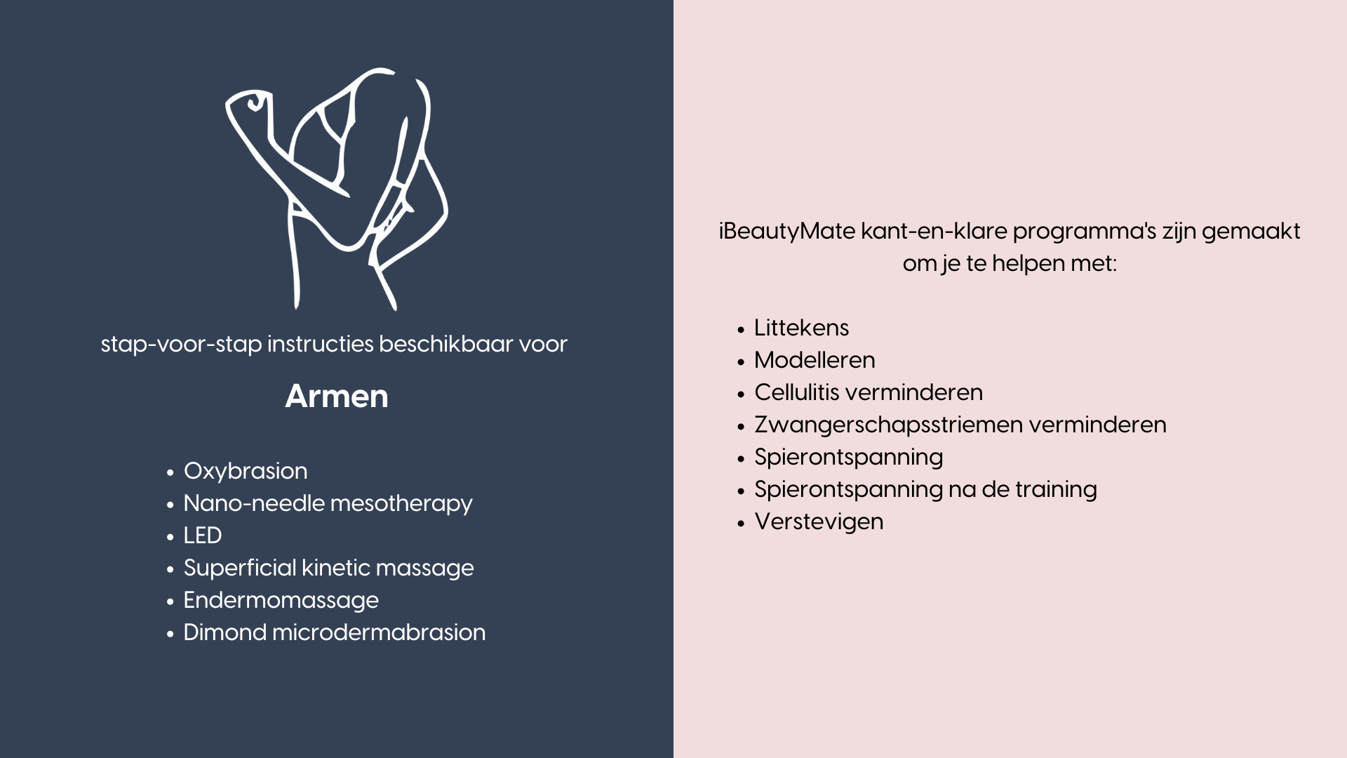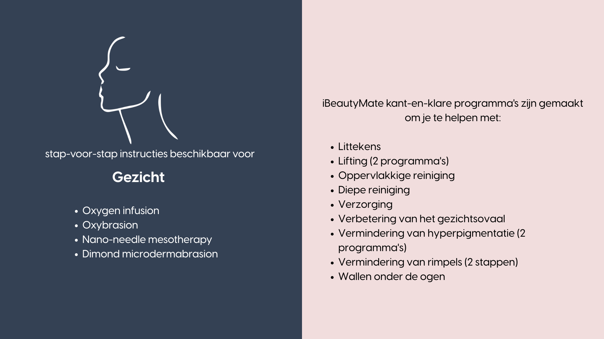 Aangedreven door geavanceerde cosmetologische technologieën, levert iBeautyMate zichtbare, blijvende resultaten voor een reeks van gewenste schoonheidsbehandelingen. Het is geschikt voor gezichts- en lichaamsbehandelingen en sluit aan bij protocollen die gebruikt worden in professionele praktijken.
