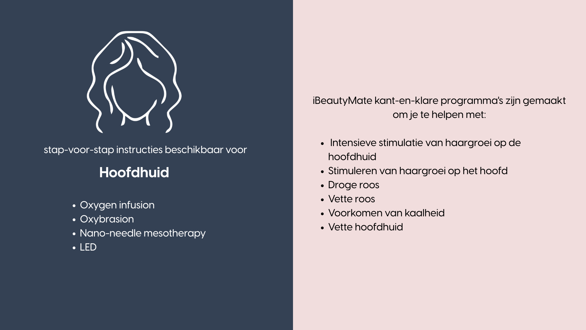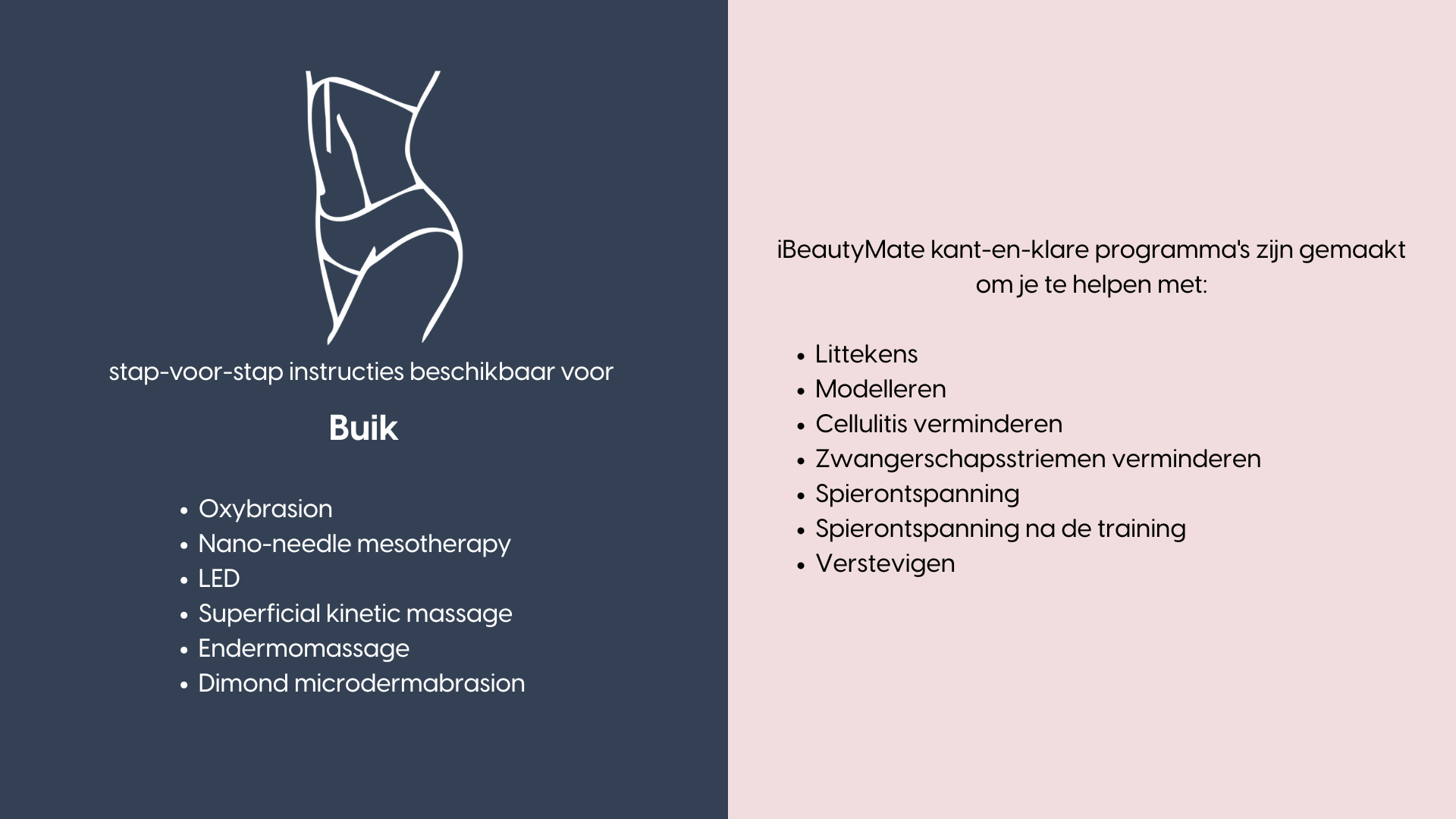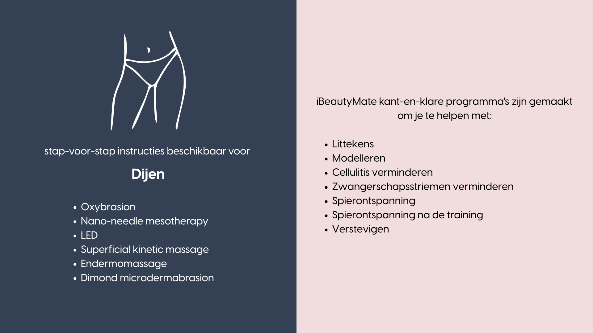 Aangedreven door geavanceerde cosmetologische technologieën, levert iBeautyMate zichtbare, blijvende resultaten voor een reeks van gewenste schoonheidsbehandelingen. Het is geschikt voor gezichts- en lichaamsbehandelingen en sluit aan bij protocollen die gebruikt worden in professionele praktijken.