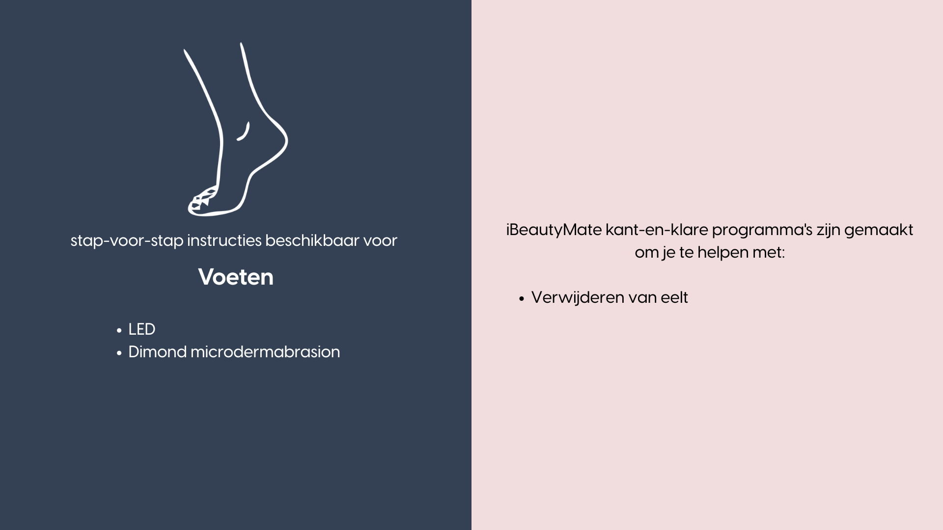- Volledige lichaamsverzorging met op maat gemaakte behandelingen voor elk gebied. iBeautyMate past parameters automatisch aan op basis van het geselecteerde lichaamsdeel.