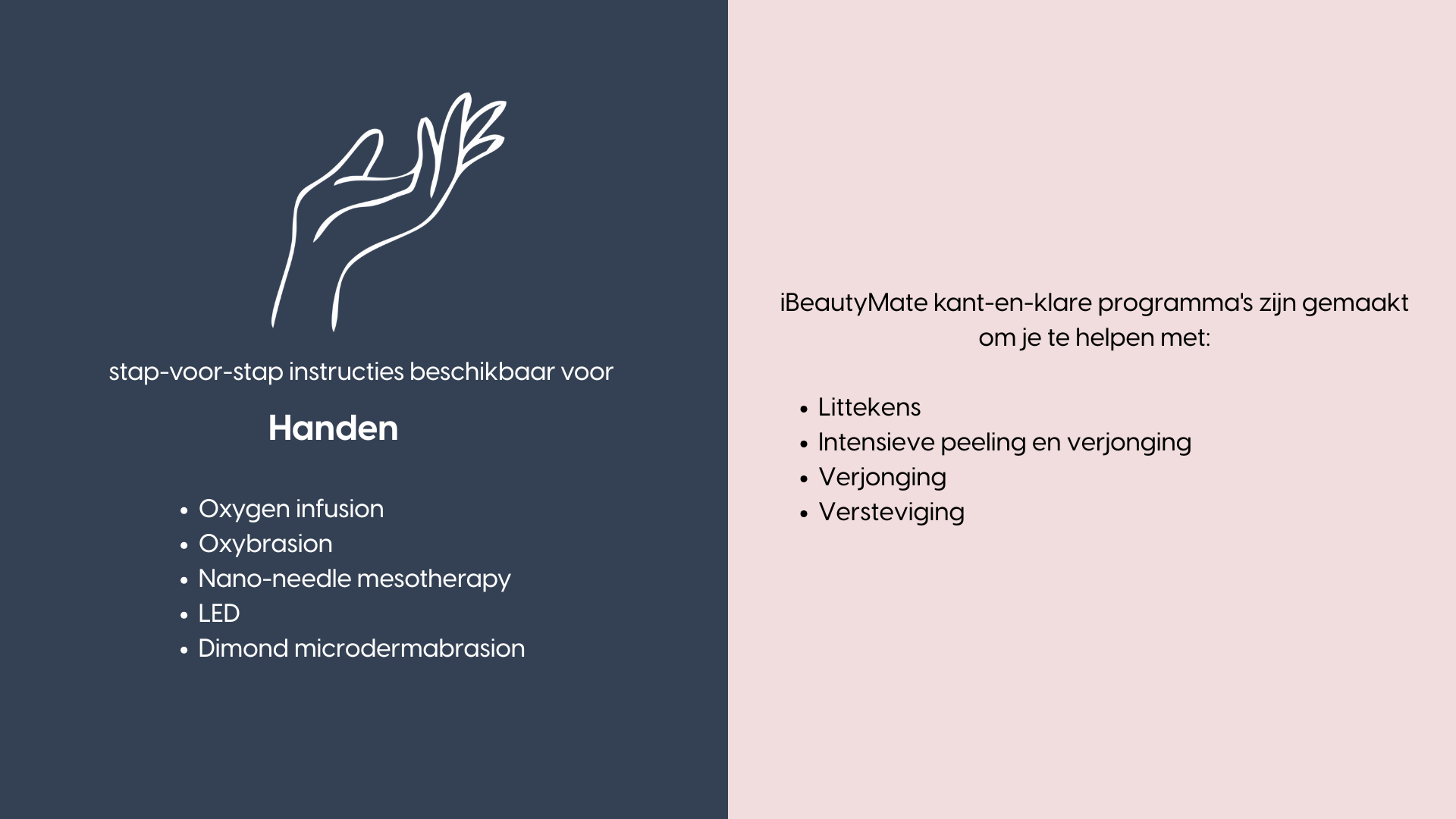 Met iBeautyMate kunt u een volledig scala aan veelgevraagde schoonheidsbehandelingen aanbieden, allemaal vanuit één apparaat: