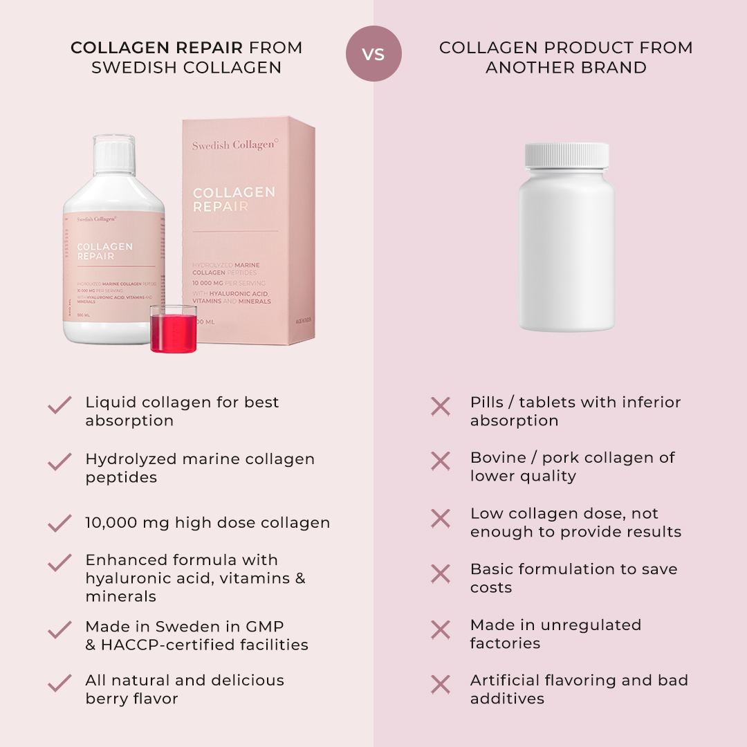 Swedish Collagen Repair bevat 10.000 mg gehydroliseerd marien collageen (viscollageen). De unieke formule bevat ook 50 mg hyaluronzuur en een grote hoeveelheid D-biotine, vitamine C, B12 en D3 alsmede Zink en MSM. Een totaal van 15 actieve ingrediënten werken samen om het collageengehalte in het lichaam te verhogen en rimpels te voorkomen.